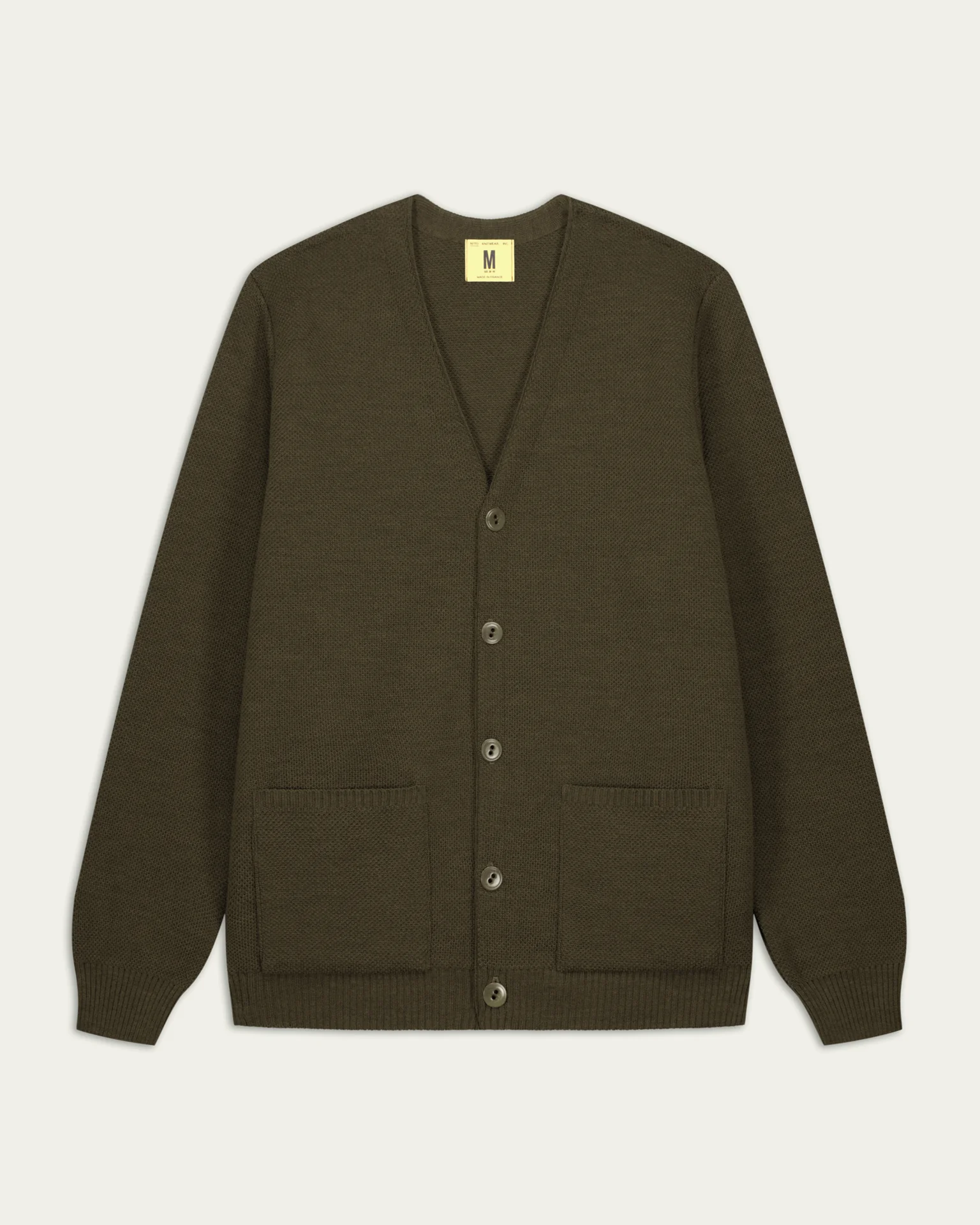 On retrouve la même maille piquée, le même toucher, les mêmes coloris. Les deux poches sont tricotées dans la même maille et cousues directement sur la pièce. Le col et la boutonnière sont surpiqués par l'intérieur d'une bande tricotée en maille jersey, pour assurer une bonne tenue. Ses 5 boutons en corozo, un matériau naturel issu de la noix d’un palmier, sont fabriqués et teints en France, dans la baie de Somme.