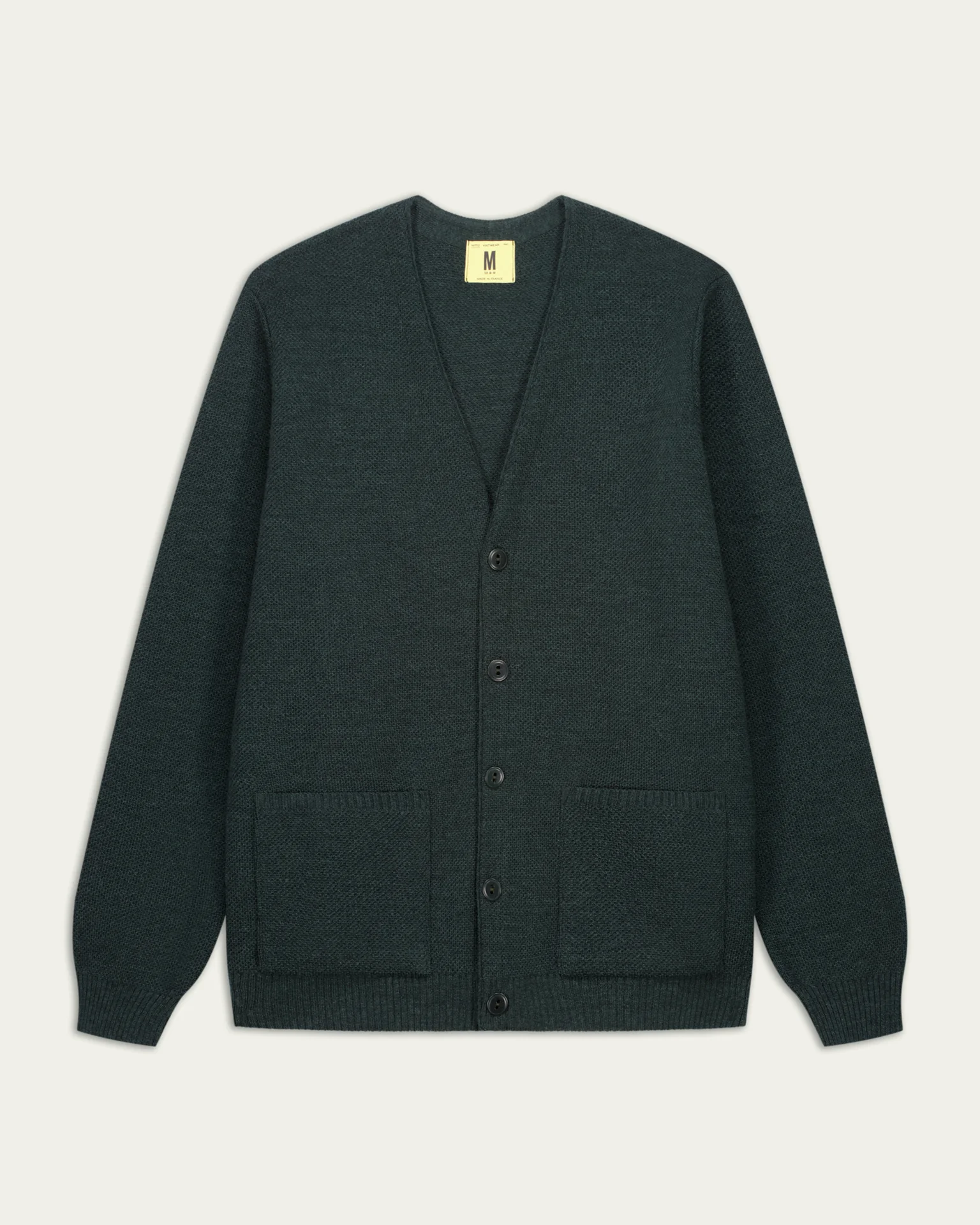 On retrouve la même maille piquée, le même toucher, les mêmes coloris. Les deux poches sont tricotées dans la même maille et cousues directement sur la pièce. Le col et la boutonnière sont surpiqués par l'intérieur d'une bande tricotée en maille jersey, pour assurer une bonne tenue. Ses 5 boutons en corozo, un matériau naturel issu de la noix d’un palmier, sont fabriqués et teints en France, dans la baie de Somme.