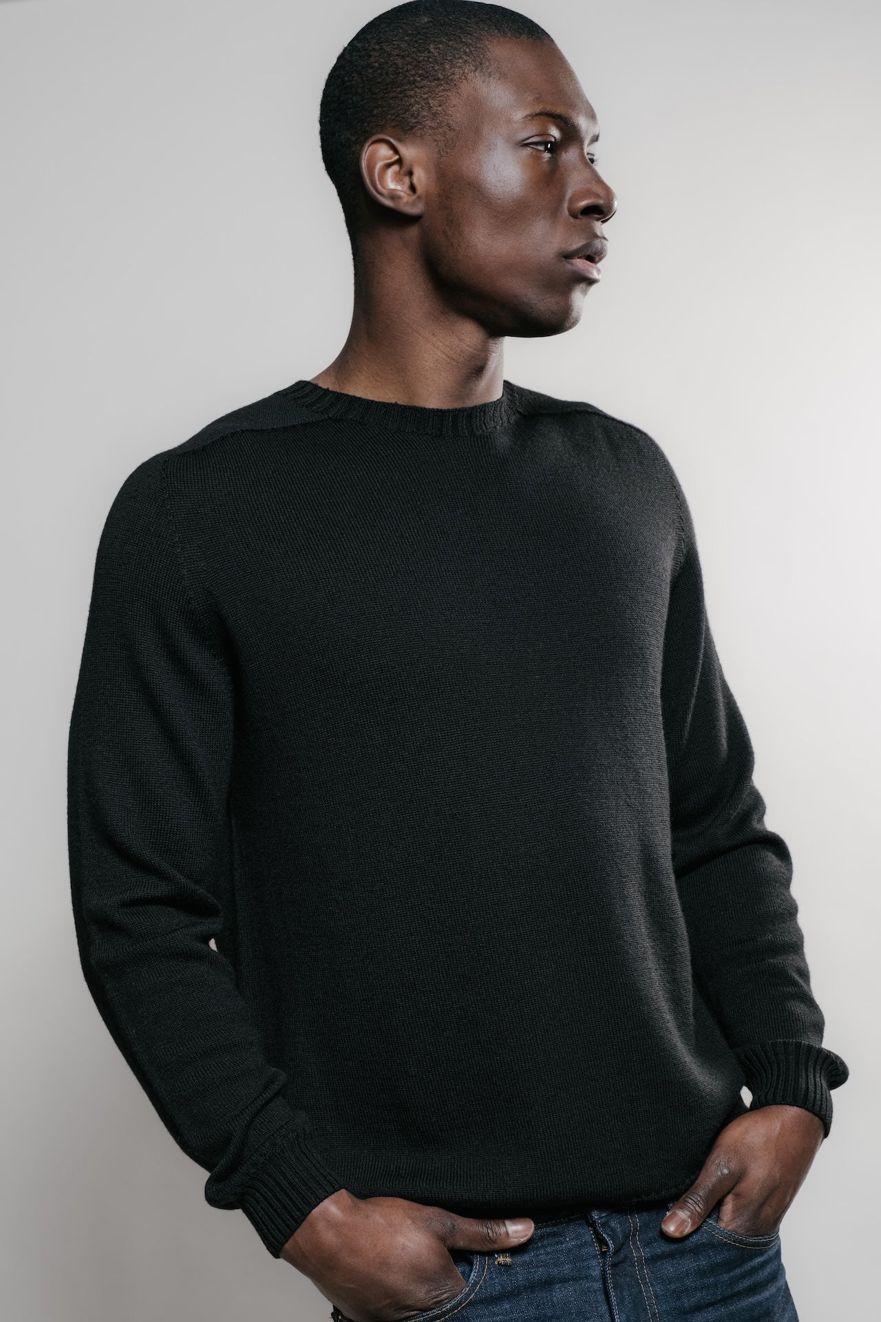 Il nous a fallu près d’un an pour créer ce pull. Tricoté en intégral, sans aucune couture, il offre une pureté et une douceur incomparables.