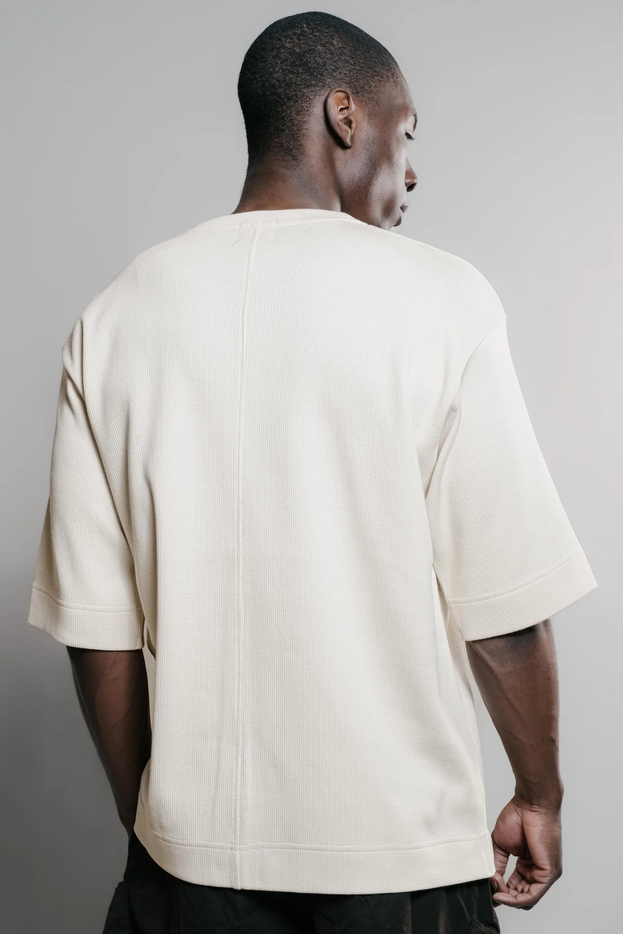 Le Vahé manches courtes est une pièce pensée avant tout pour le style. Ni sweat, ni pull, ni t-shirt, il échappe volontairement aux catégories classiques. Notre objectif était de développer une maille forte et originale.